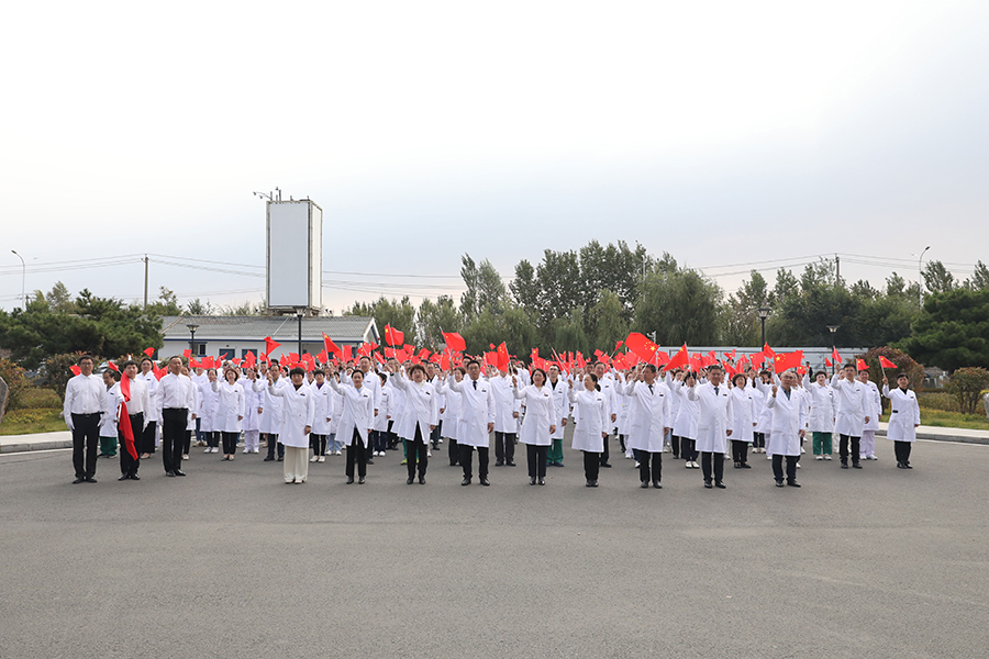 由青年医务人员组成的国旗护卫队,迈着坚定有力的步伐,护送着鲜艳的五星红旗走向升旗台。伴随着雄壮的《义勇军进行曲》,五星红旗缓缓升起,全体人员肃立,面向国旗行注目礼,齐声高唱国歌。五星红旗迎风招展,每位职工手中挥动的国旗,是心中涌动不灭的希望,这一刻生于华夏而倍感荣光。