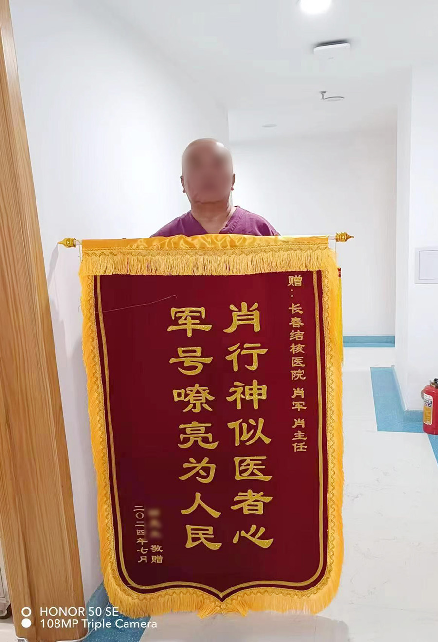 在医护人员的耐心开导和精心护理下,患者逐渐放下了戒备心,开始积极配合治疗。术后,牛先生恢复得非常好,心情也开朗起来,往日的阴霾早已烟消云散。为了表达感激之情,他特意为肖军医生和责任护士姜红各送上一面锦旗,还非常用心地以藏头诗的形式,亲自编写了锦旗上的文字。