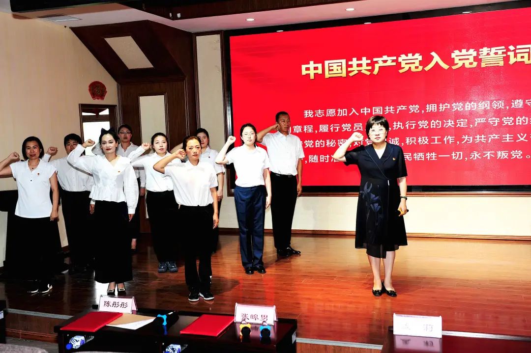 在陈彤彤副书记的带领下,全体党员高举右手,面向鲜红的党旗,庄严宣誓,“我志愿加入中国共产党,拥护党的纲领,遵守党的章程,履行党员义务……”