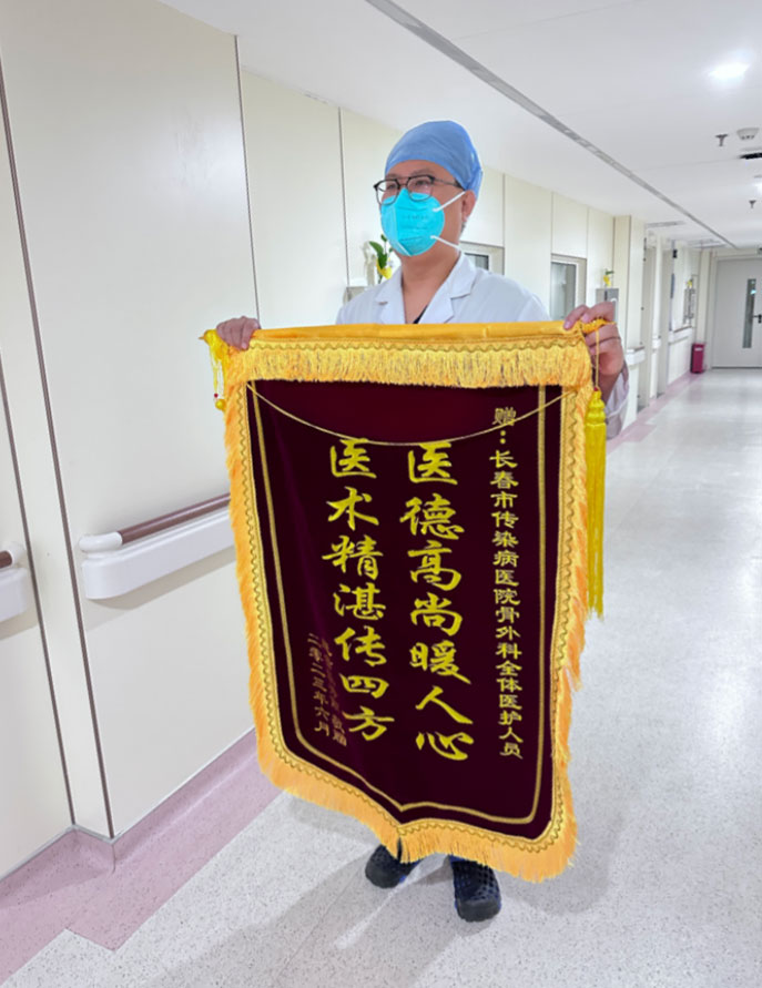 经过两个多月的积极治疗,患者情况稳定,顺利出院。出院前,患者家属将锦旗、鲜花和水果送到了科室,以此表示对骨科·普外科(八疗区)全体医护人员的感激之情。