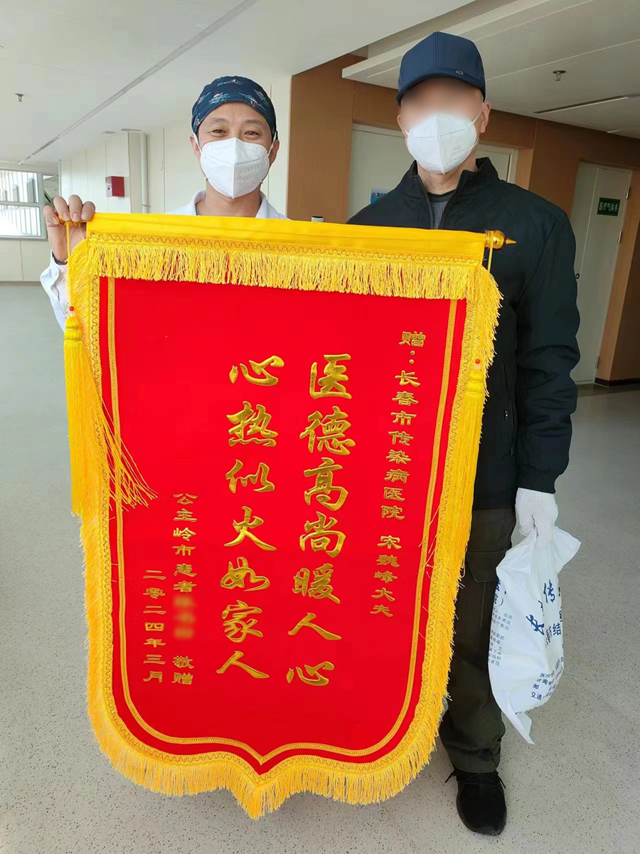 为了表达对医护人员的感激之情,陈先生将精心制作的锦旗交到田子刚主任、宋巍峰医生和赵立萍护士长的手中。
