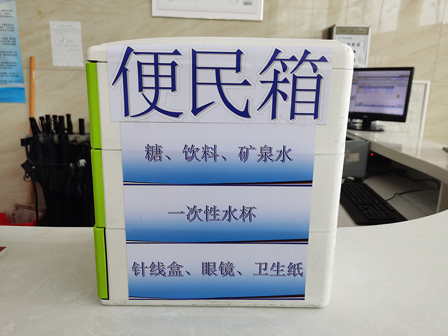 此外,医院导诊处还为患者提供了糖、饮料、矿泉水、一次性水杯、针线盒、眼镜、卫生纸、雨伞等物品,以备患者需要。