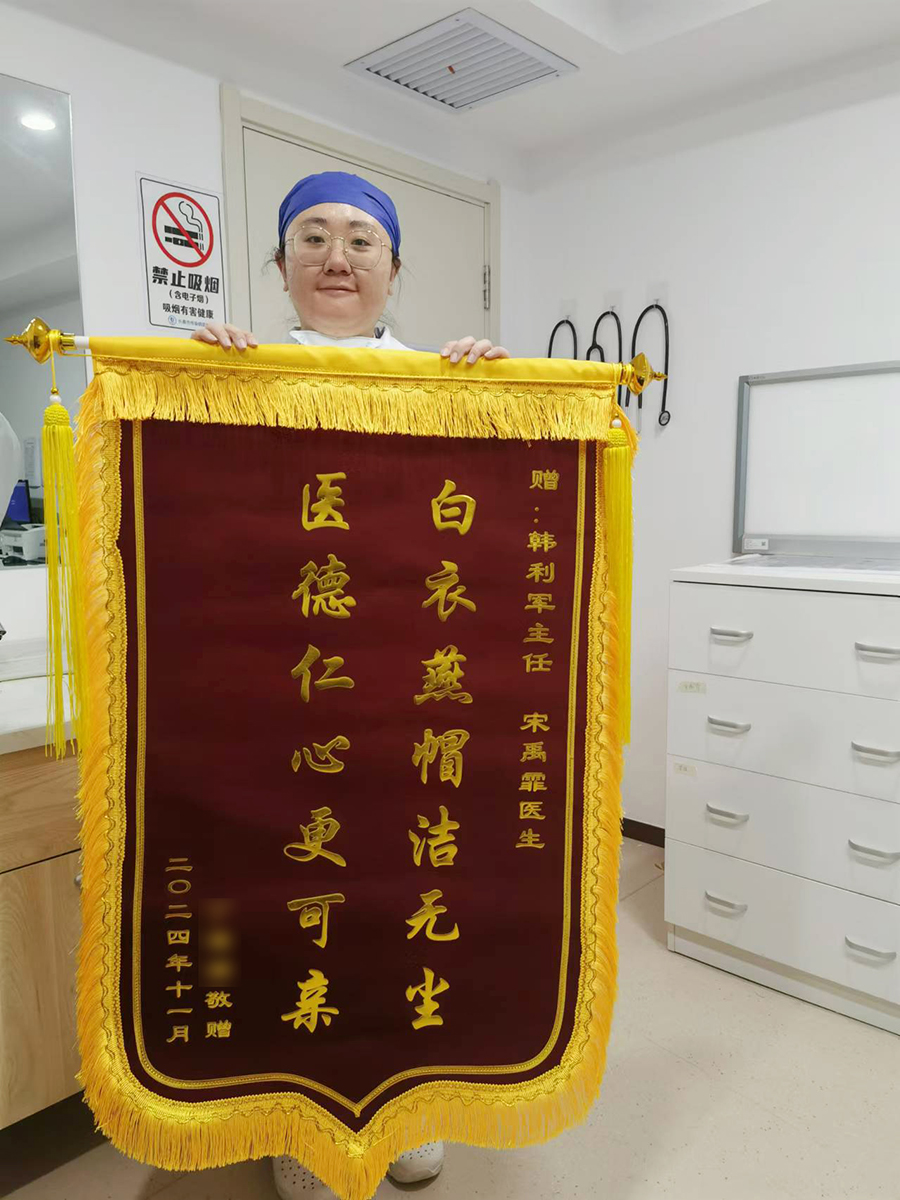 出院前,郭先生特意定制了一面锦旗,表达对韩利军主任以及宋禹霏医生的感激和敬意。