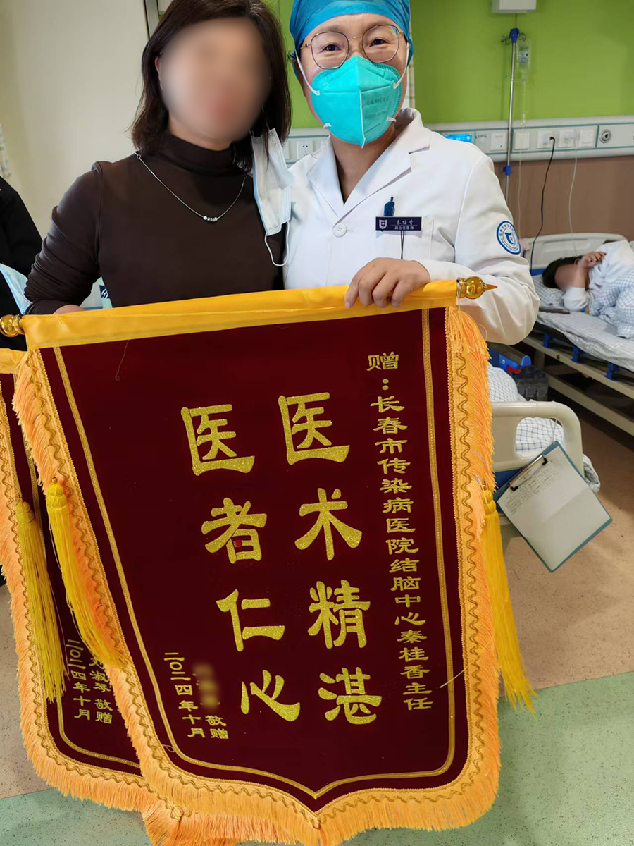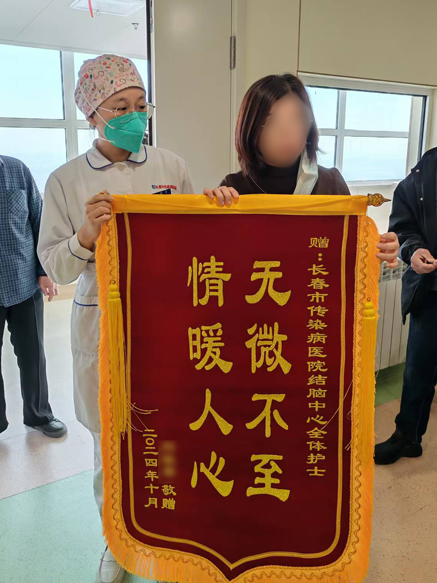 近日,结脑中心(五疗区)病房内热闹不已,患者王女士(化名)满脸笑意,将4面锦旗分别送给了科室主任韩利军、副主任秦桂香、医生赵雪瑶,以及护理团队。