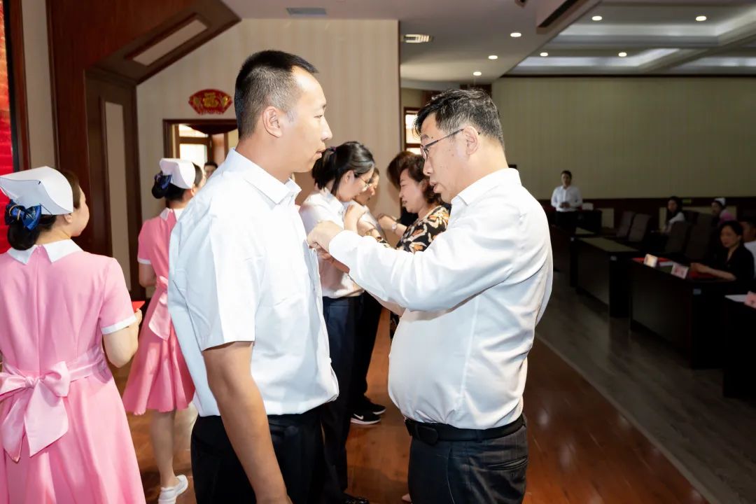 会上,市卫健委机关党委专职副书记孟莉,院党委书记张皞男,院党委副书记、院长曹阳,为预备党员佩戴党徽。